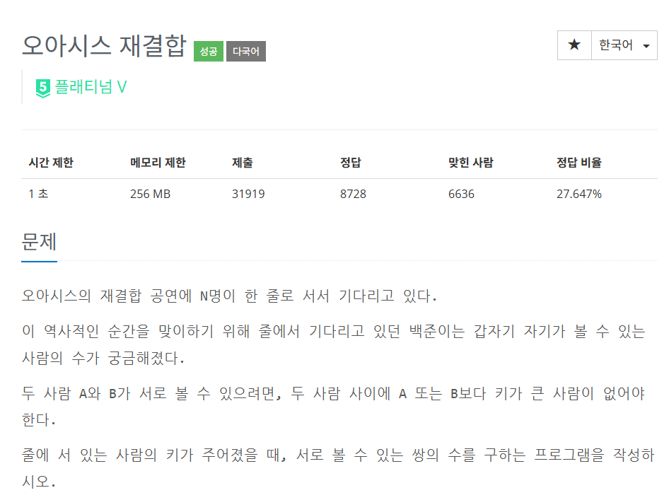 [백준] 3015 - 오아시스 재결합 (C++)