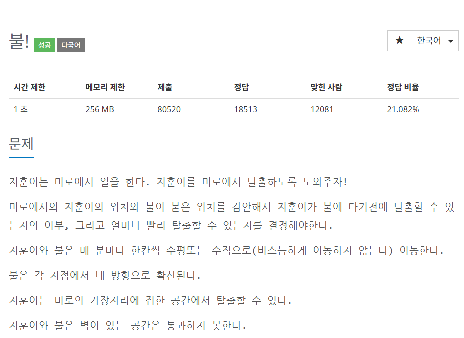 1. 문제 소개 2. 해결 방안과 알고리즘 BFS로 최단거리를 계산할 수 있다. 근데 불이랑 지훈이의 움직임을 둘 다 계산해야 한다. 만약에 fire가 먼저, 지훈이가 지나가야 할 특정 칸에 닿으면(즉, 기록하는 숫자가 fire 3. 코드 #include #include #include #include #include using namespace std;int dx[] = {1, 0, -1, 0};int dy[] = {0, 1, 0, -1};string board[1002];int fire[1002][1002];int escape[1002][1002];queue> qf;queue> qe;int main(){ ios::sync_with_stdio(false); cin.tie(nullpt..